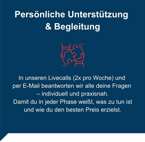Anschließend begleiten wir dich mit Umsetzungsvideos, Livecalls (2x pro Woche) und individuellem E-Mail-Support – bis zum erfolgreichen Abschluss deines Verkaufs.